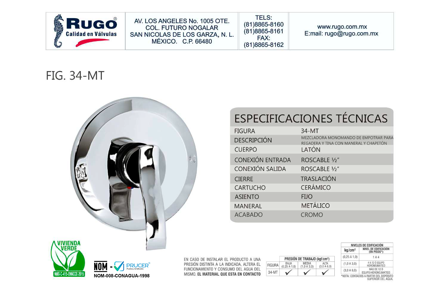 Monomando para Regadera y Tina, Acabado: Cromo