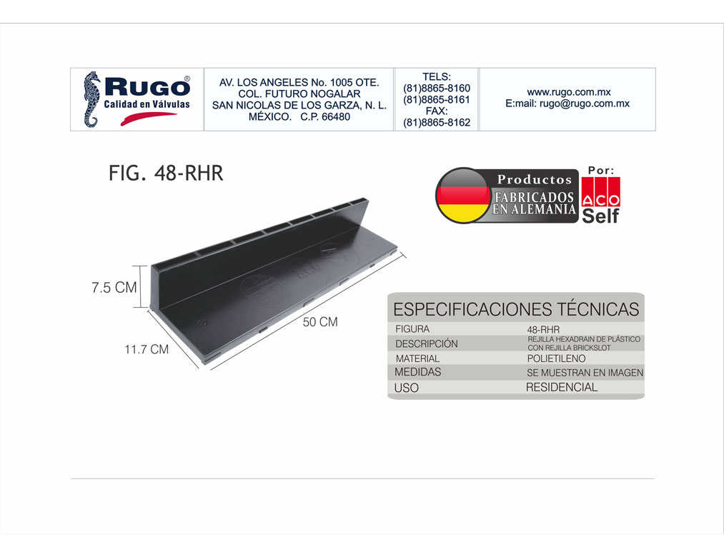 48-RHR48-RHRInformación del productoBaño CanaletaDescripción Rejilla Hexaline de plástico negro c/Rejilla Brickslot, Medida: 5m Especificaciones técnicasESPECIFICACIONES TÉCNICASVer ficha técnica