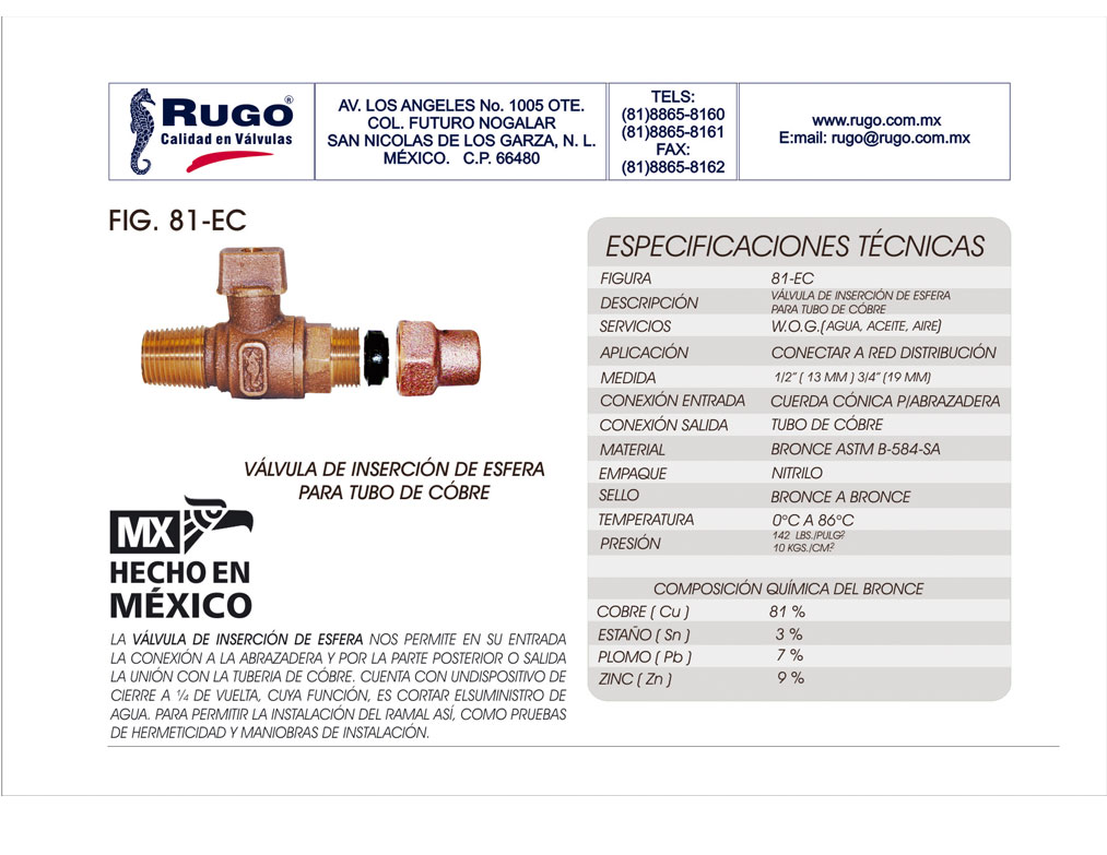 Válvula Inserción Tubo de Cobre, Medidas: 13mm /19mm /22mm