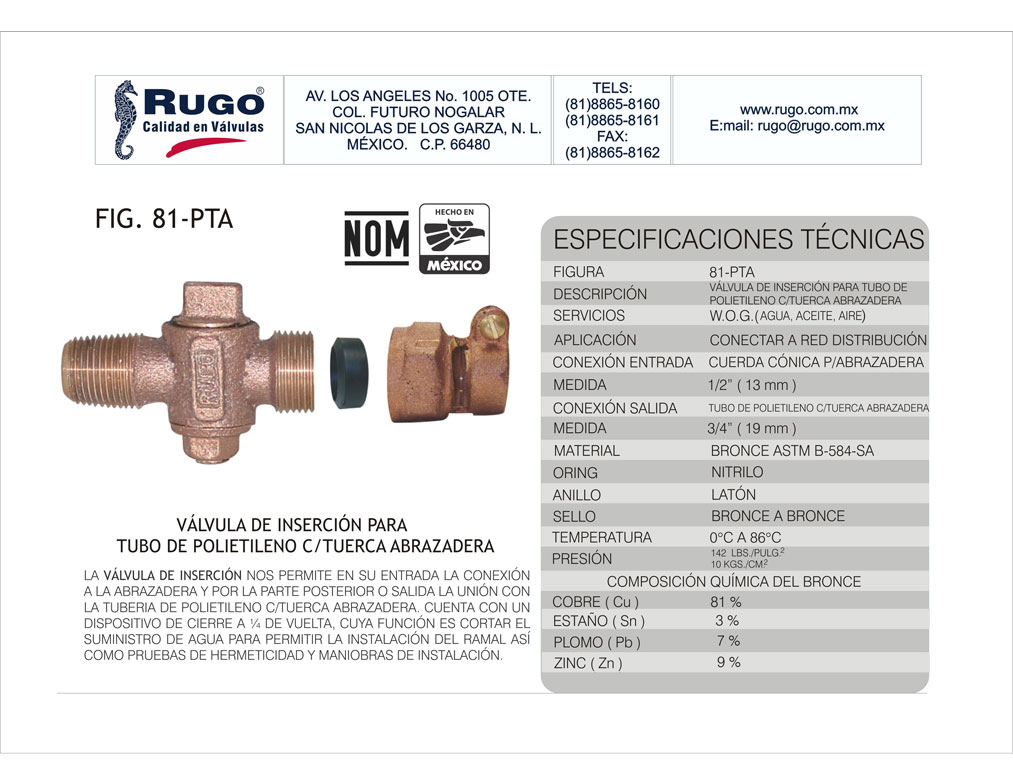 Válvula Inserción Tubo de Cobre, Medidas: 13mm /19mm /22mm