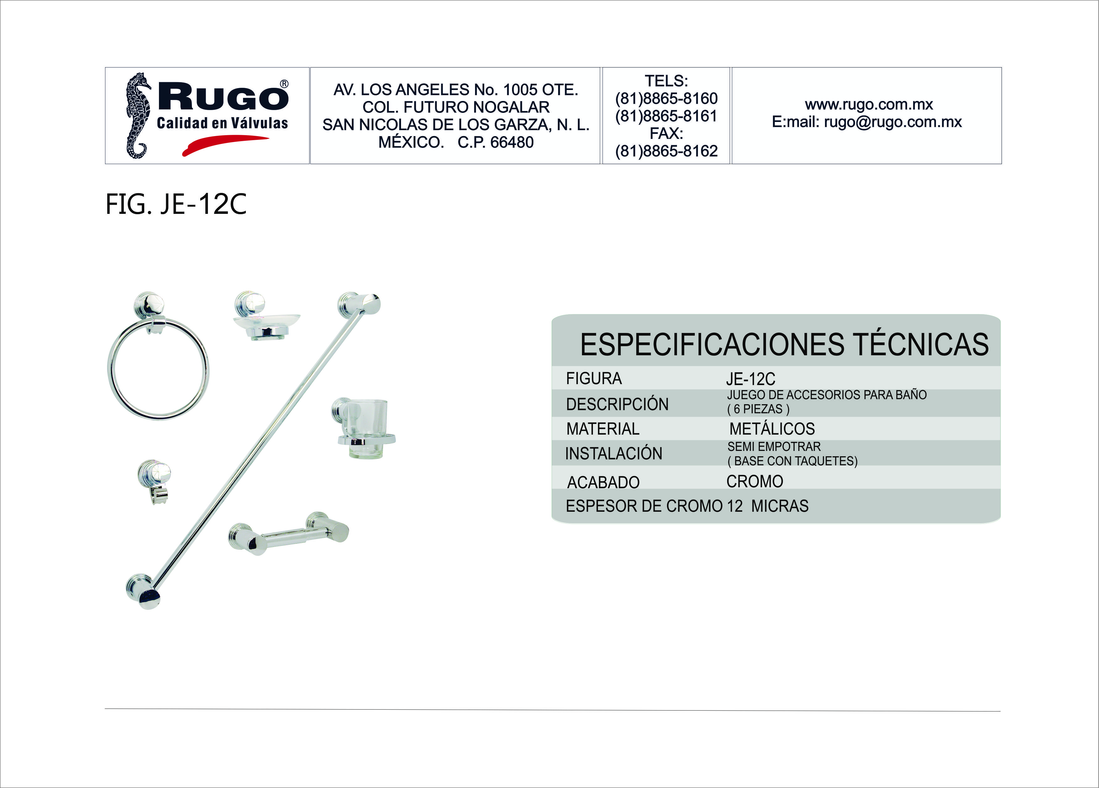 JE-12CJE-12CInformación del productoBaño AccesoriosDescripción Juego de Accesorios para Baño, Acabado: Cromo Especificaciones técnicasESPECIFICACIONES TÉCNICASVer ficha técnica