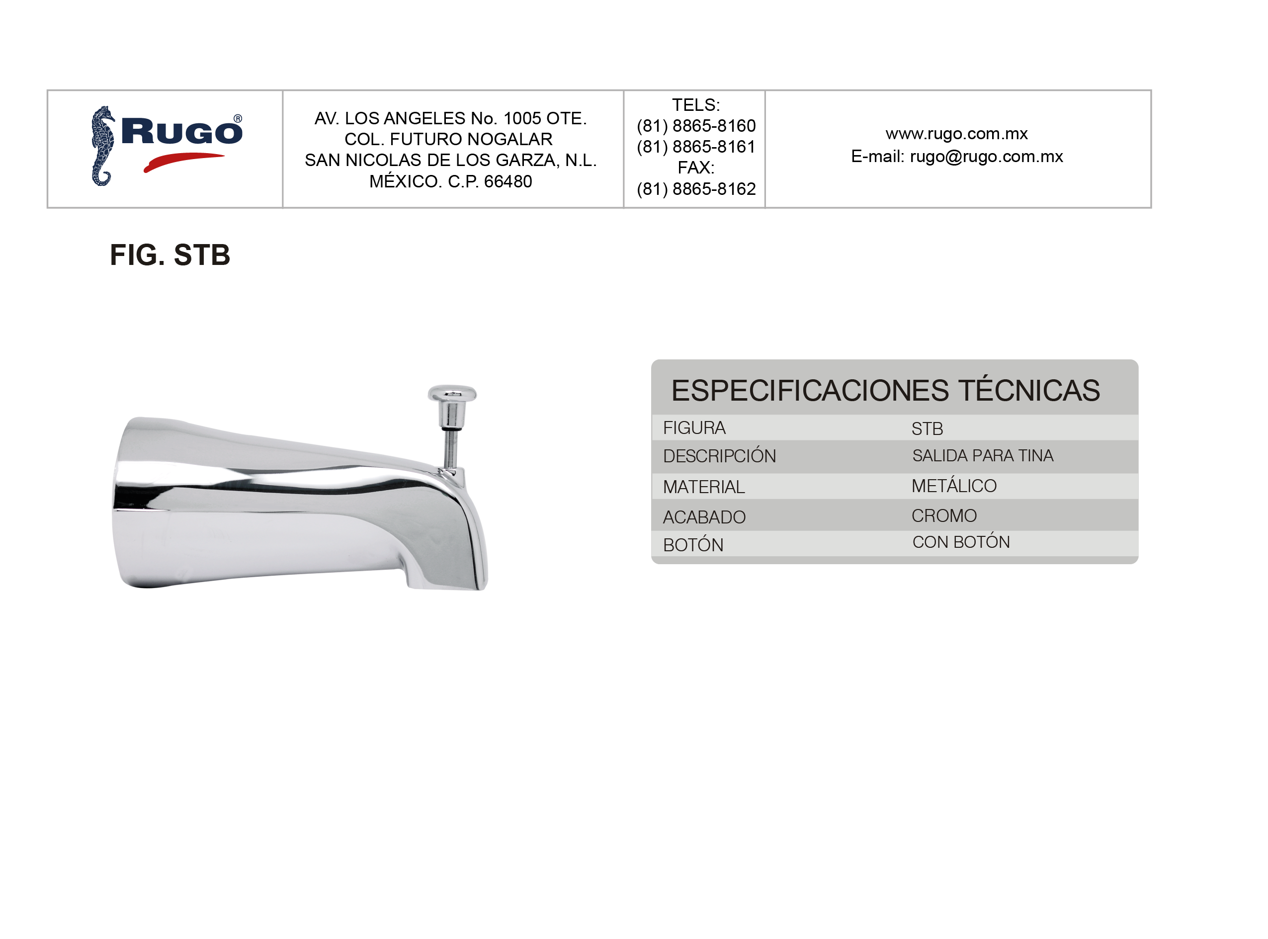 STBSTBInformación del productoBaño SalidatinaDescripción Salida para Tina con botón | acabado Cromo Especificaciones técnicasESPECIFICACIONES TÉCNICASVer ficha técnica