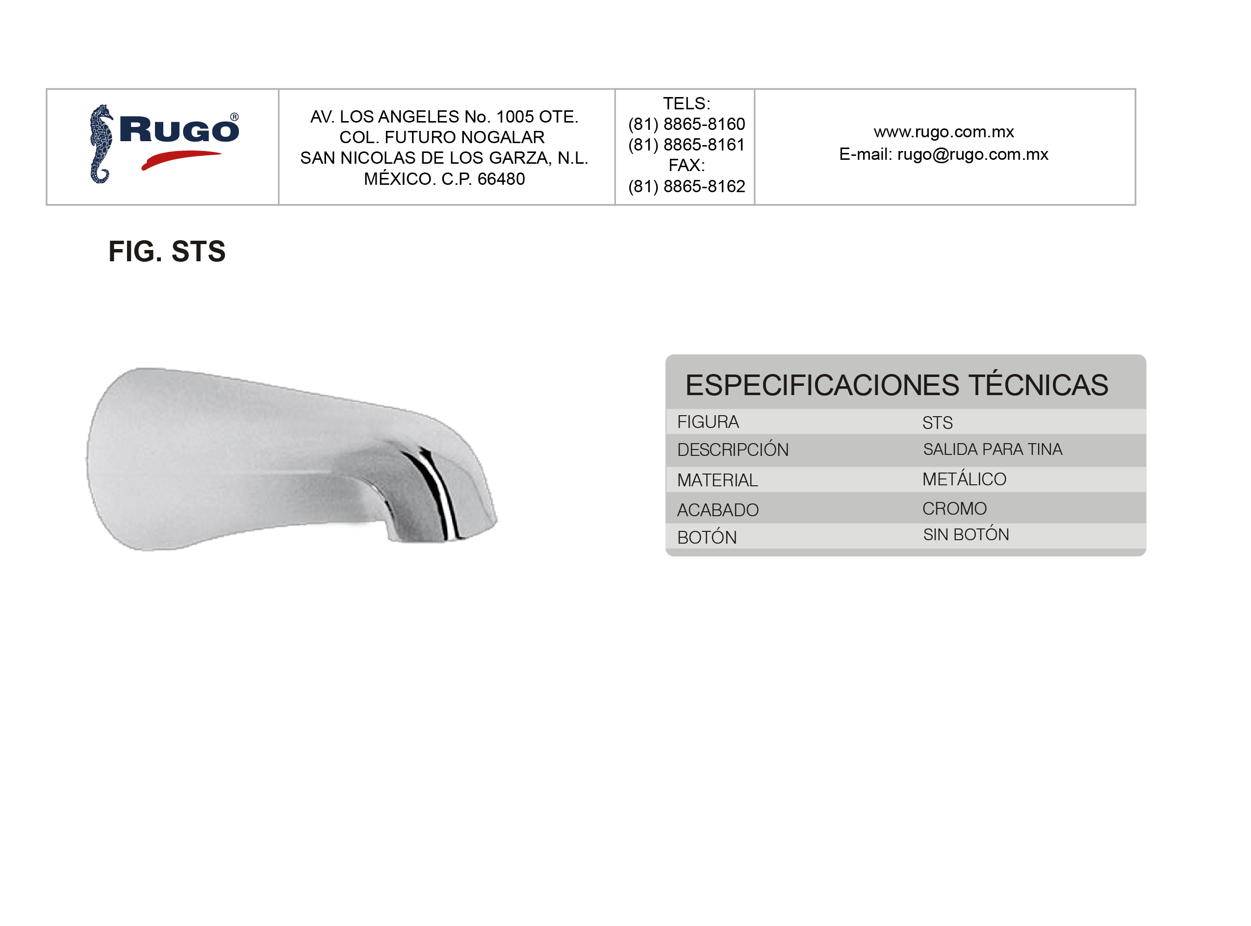 STSSTSInformación del productoBaño SalidatinaDescripción Salida para Tina sin botón | acabado Cromo Especificaciones técnicasESPECIFICACIONES TÉCNICASVer ficha técnica